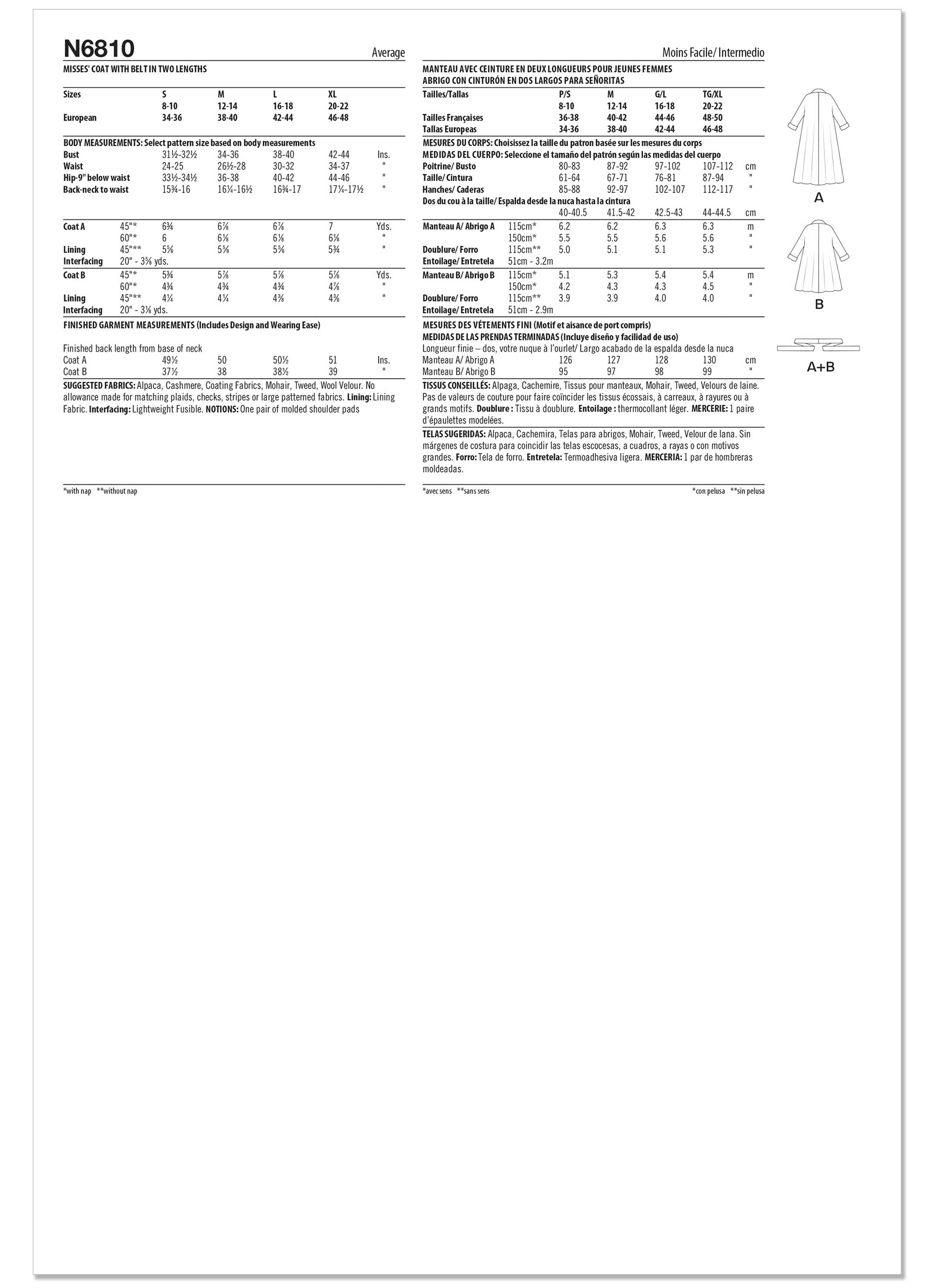 Fabric Suggestions:  Alpaca, Cashmere, Coating Fabrics, Mohair, Tweed, Wool Velour. No allowance made for matching plaids, checks, stripes or large patterned fabrics. Lining: Lining Fabric. Interfacing: Lightweight Fusible.