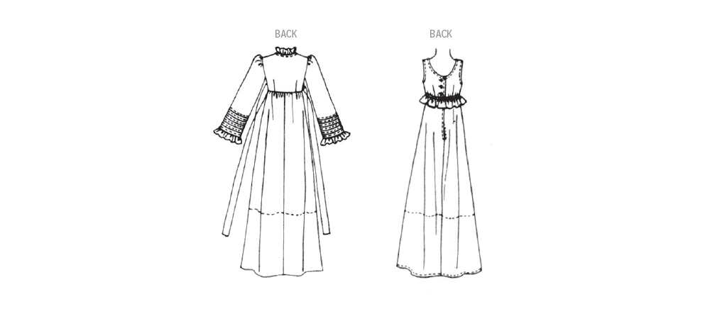 Vintage McCall's 1970's robe and nightgown by Laura Ashley sewing pattern. High waisted, front wrap robe has neck and sleeve ruffles, tie belt drawn thru seam opening; sleeves have gathered cap and lower tucks. High waisted, back buttoned nightgown has ruffle; bias tape drawstring drawn thru casing ties in front. Authentic Vintage Reproduction.