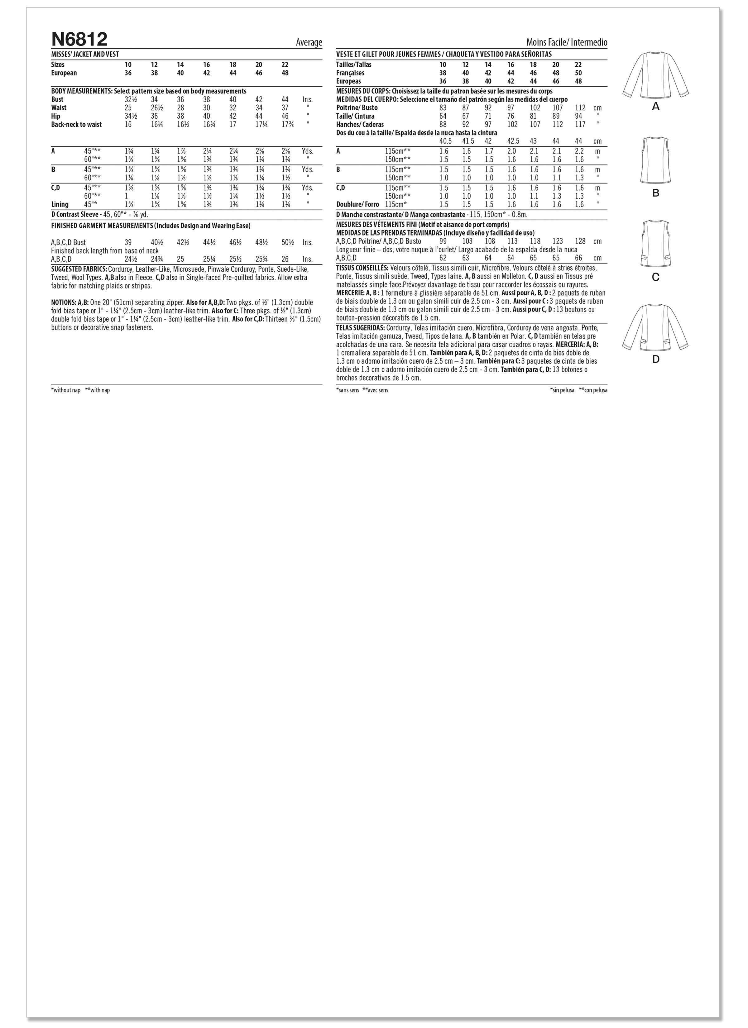 Fabric Suggestions:  Corduroy, Leather-Like, Microsuede, Pinwale Corduroy, Ponte, Suede-Like, Tweed, Wool Types. A,B also in Fleece. C,D also in Single-faced Pre-quilted fabrics. Allow extra fabric for matching plaids or stripes.