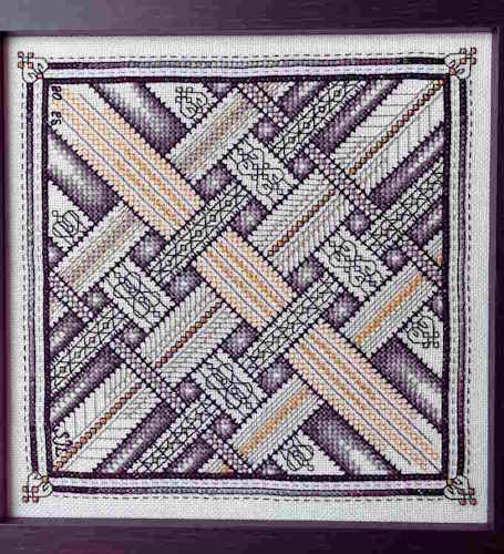 Our current, stunning blackwork project, entitled Ribbons, designed by Sally, is a fabulous mix of classic and modern stitches, patterns and threads.