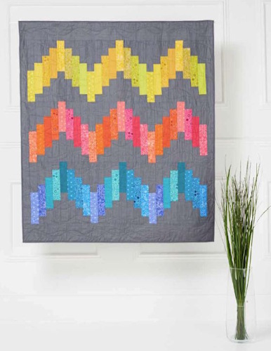 Fabric strips in graded colours move up and down like sound waves across the quilt. This is an excellent project to use up 2.5" strips of fabric scraps and there is great fun in grading the fabric colours into a pleasing design.